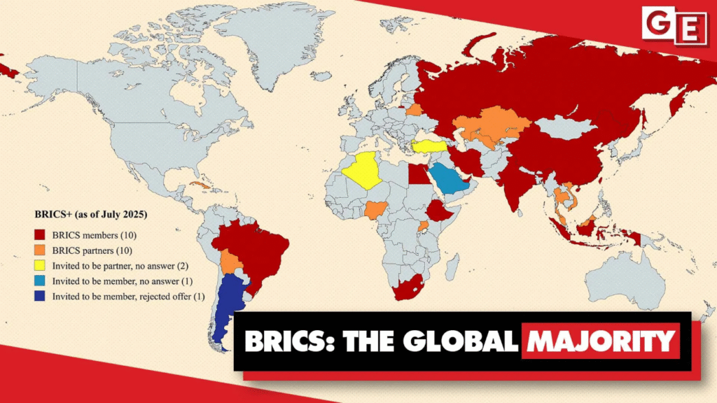 El 1 de enero de 2024, cuatro países se incorporaron a los BRICS como miembros plenos: Egipto, Etiopía, Irán, y Emiratos Árabes Unidos (Argentina recibió invitación pero Milei la rechazó). Arabia Saudita también fue invitada, pero postergó su adhesión oficial al bloque. En 2025, Indonesia se unió como miembro pleno. Todos estos países son estratégicos para el establecimiento de corredores económicos para los BRICS. Además de los miembros plenos, hay diez Estados asociados confirmados: Bolivia, Bielorrusia, Cuba, Kazajistán, Malasia, Nigeria, Tailandia, Uganda, Uzbekistán, y Vietnam. En conjunto, los países BRICS tienen un 43.93% del PBI mundial, el 55.61% de la población mundial, y aproximadamente un tercio del territorio mundial. Además, BRICS impulsa instituciones multilaterales distintas —aunque no antagónicas— al Banco Mundial, el FMI, o la OCDE, como el Nuevo Banco de Desarrollo y el Acuerdo de Reservas de Contingencia. Tal como puede observarse en el mapa 2, este espacio representa una enorme amenaza para la hegemonía estadounidense y su control sobre las rutas comerciales.