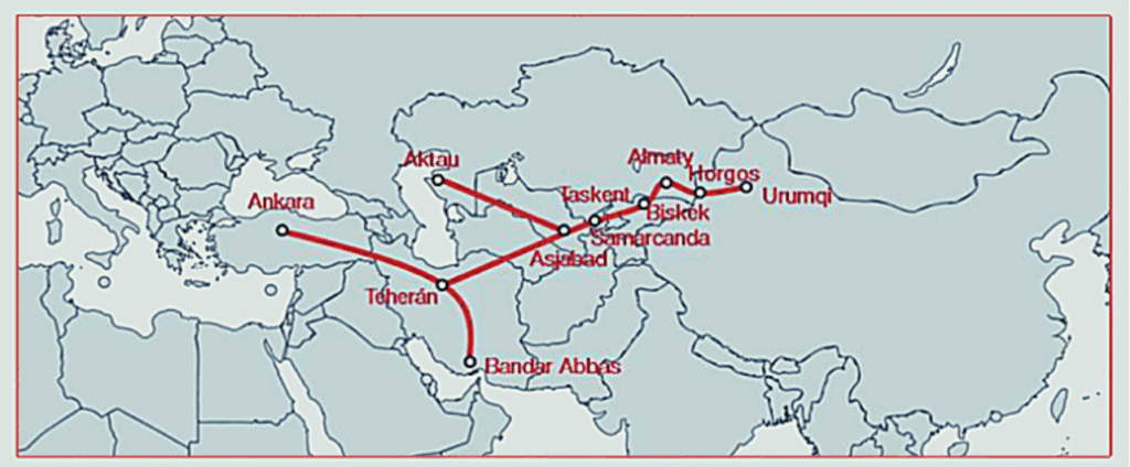 Entre los países BRICS, China es vista como rival sistémico y competencia estratégica de los países del Atlántico Norte. Representa alrededor del 70% del PBI del conjunto de miembros; estableció diferentes instituciones multilaterales como el Banco Asiático de Inversión en Infraestructura y la Asociación Económica Integral Regional; llama a comerciar en monedas locales —incluso con Arabia Saudita, marcando el fin del petrodólar desde 1973—; medió exitosamente entre Arabia Saudita e Irán para el restablecimiento de sus relaciones diplomáticas y por la reincorporación de Siria a la Liga Árabe; y, mediante la Iniciativa de la Franja y la Ruta (IFR) —su arquitectura de comercio mundial—, impulsa el “Corredor Económico China-Asia Central y Occidental” (Mapa 3) y el “Corredor Económico China-Pakistán” (Mapa 4). Por su parte, otros miembros BRICS que impulsan corredores logísticos son Rusia e India con el “Corredor Internacional de Transporte Norte-Sur” (Mapa 5). Estos corredores logísticos atraviesan Afganistán, Pakistán, e Irán, países todos con —casualmente— conflictos militares abiertos. La conexión hacia el oeste que procura China es una forma de garantizar un salvoconducto comercial en caso de que EEUU empujara a un conflicto en la isla de Taiwán, puesto que dicho potencial inhabilitaría la salida marítima de China hacia el Estrecho de Malaca.